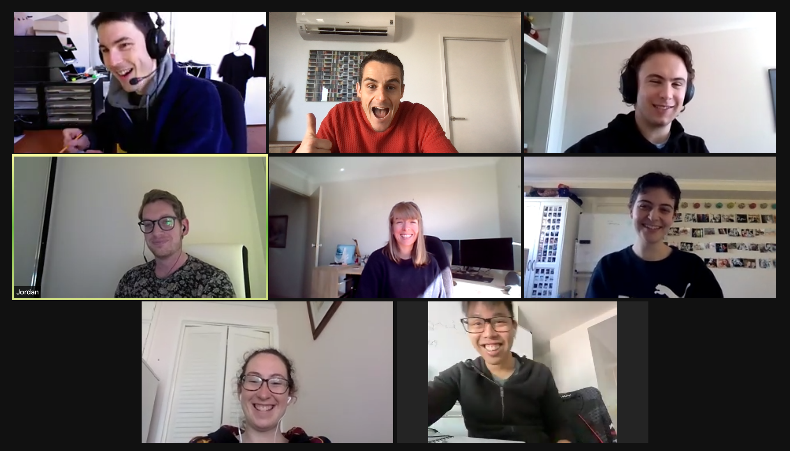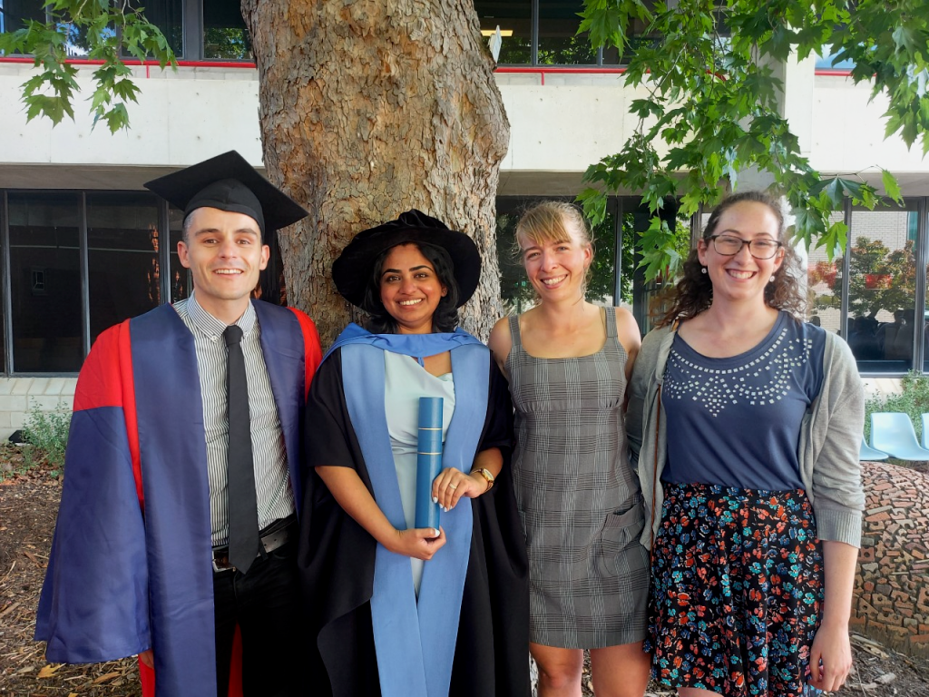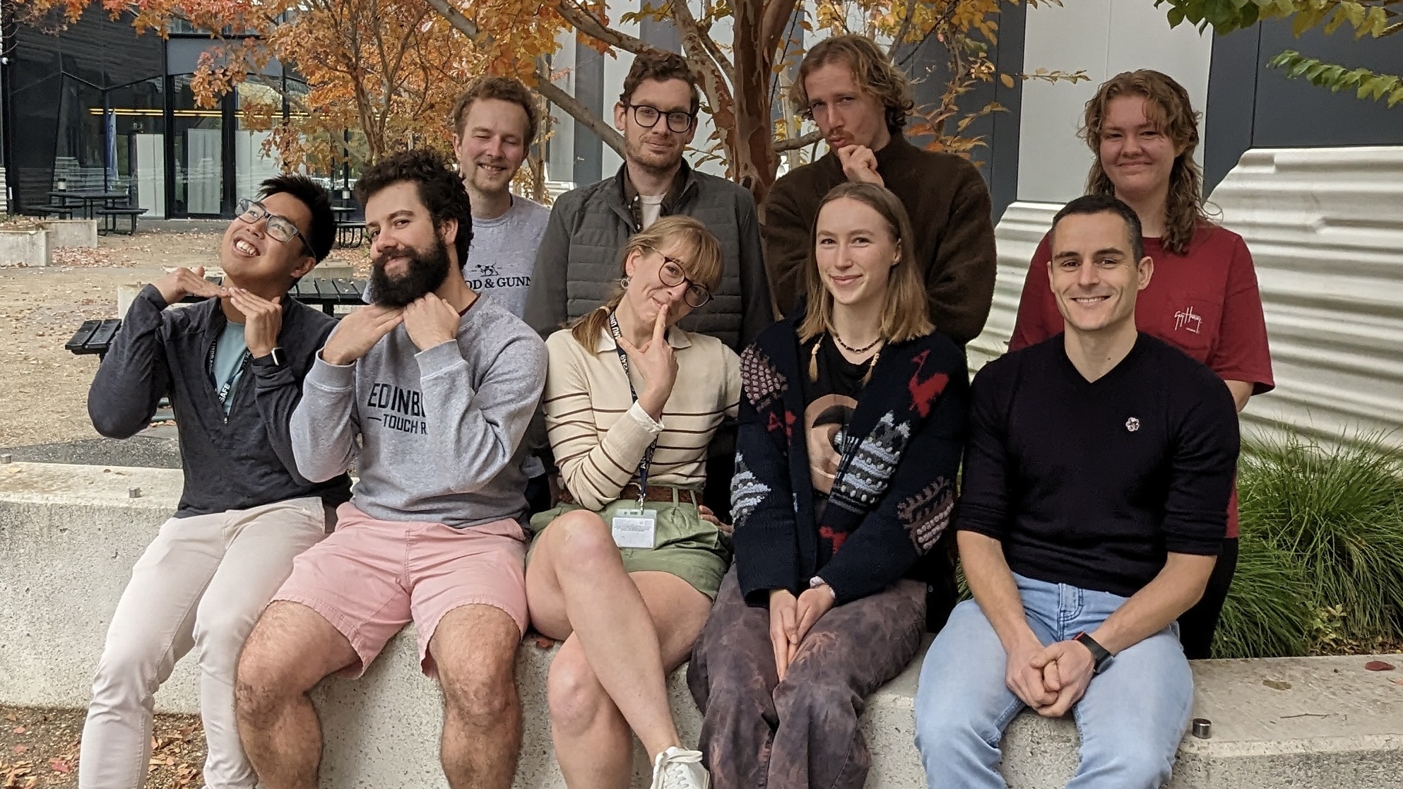 A “nice” photo? (May 2024) Back row, from left: Logan, Jordan, Rory, Nina. Front row, from left: Petch, Callum, Rosie, Meabh, Nick.Graduation ceremony for the group’s first doctor (Feb 2022). Congrats Chriso!! From left: Nick, Chriso, Rosie, Emer.Group photo (August 2021): Unfortunately Canberra is in lockdown so we’re forced to take a Zoom group photo. Top row from left: Craig, Nick Oscar; middle row from left: Jordan, Rosie, Bailee; bottom row from left: Emer, Petch.Group “Christmas” party (March 2021). From left: Emer, Chriso, Rosie, Petch, Jason, Dan Preston (DECRA fellow – not part of the group, but we like hanging out with him anyway).Group photo (December 2020). From left: Nick, Rosie, Emer, Chriso and Gemma.Group photo (August 2019). From left: Gareth, Rosie, Chriso, Indy, Emer and Zeke.Group photo (April 2019). From left: Nick, Rosie, Zeke, Emer and Chriso.Author bio picture for a review article (Feb 2019). From left: Steph, Emer, Chriso and Nick.The group snapped while eating lunch on a sunny winter’s day (August 2018).Steph might have won minigolf, but by the looks of it Chriso had the most fun!Congrats Rosie, who graduates with BSc(Hons).Tom, Rosie and Steph at the beach. Steph looks unimpressed.Group outing to the Riddle RoomTom graduates with BSc(Hons) – congrats Tom!Hilarity (and cake) for Rosie’s birthdayAn actually nice group photo!Alfred and Kathy enjoying coffee in the sun at one of the cafes on campus.The group mascot – the kangaroo chemist (drawing by Jenn Lee).